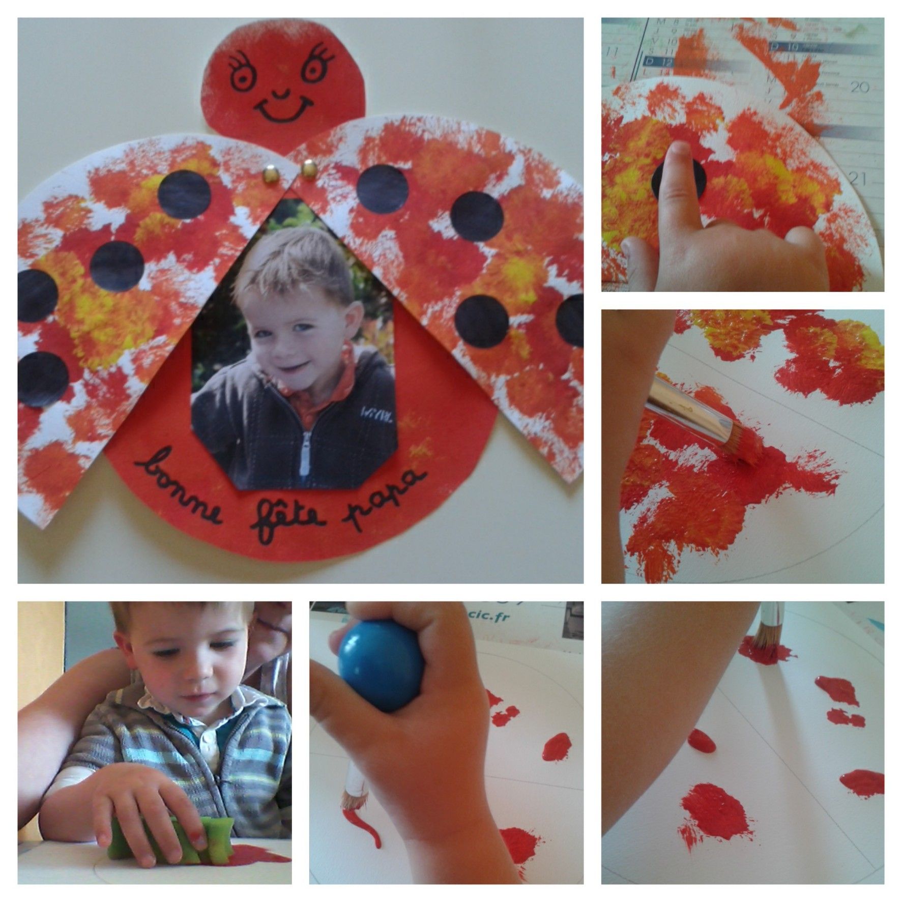 Cette semaine, nous avons préparé la petite surprise pour le papa de Simon : nous avons peint d'abord à l'éponge le corps de la coccinelle, puis au pinceau les ailes !